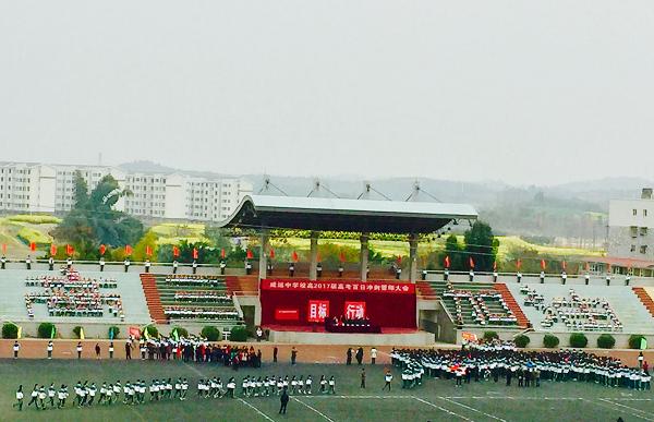 逐梦想许百日誓言,撒热血搏高考成功。为激励高三学子以更加饱满的热情和必胜的信念迎接高考,2月27日下午,威远中学2017届高考百日誓师大会在运动场隆重举行。县教育局联系处室负责人、学校高三年级行政人员、高三家长代表、高三年级及高一年级全体师生参加大会。学校副校长陈运林主持大会。
