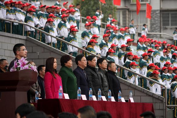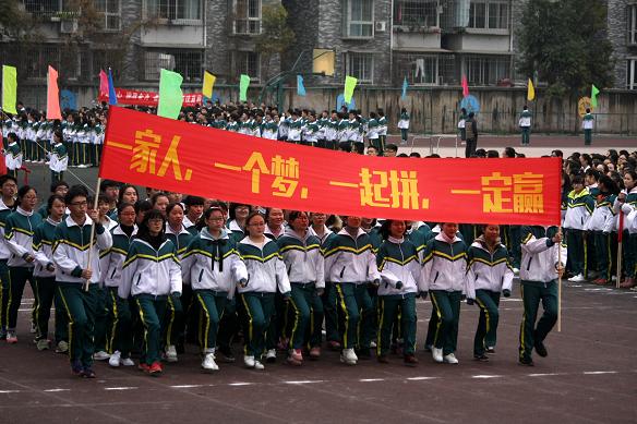 大会在激昂的运动员进行曲中拉开序幕。由高三30个班级组成的30个方队依次步入会场。他们着装整齐、步伐统一、精神抖擞、斗志昂扬,他们打着醒目的横幅,喊着响亮的口号,如征战的士兵有着必胜的信念一般前进,脚步是如此的铿锵。此时,看台上高一年级同学摆出“高三加油”四个大字,整个会场彩旗飘扬,掌声雷动,场面震撼。